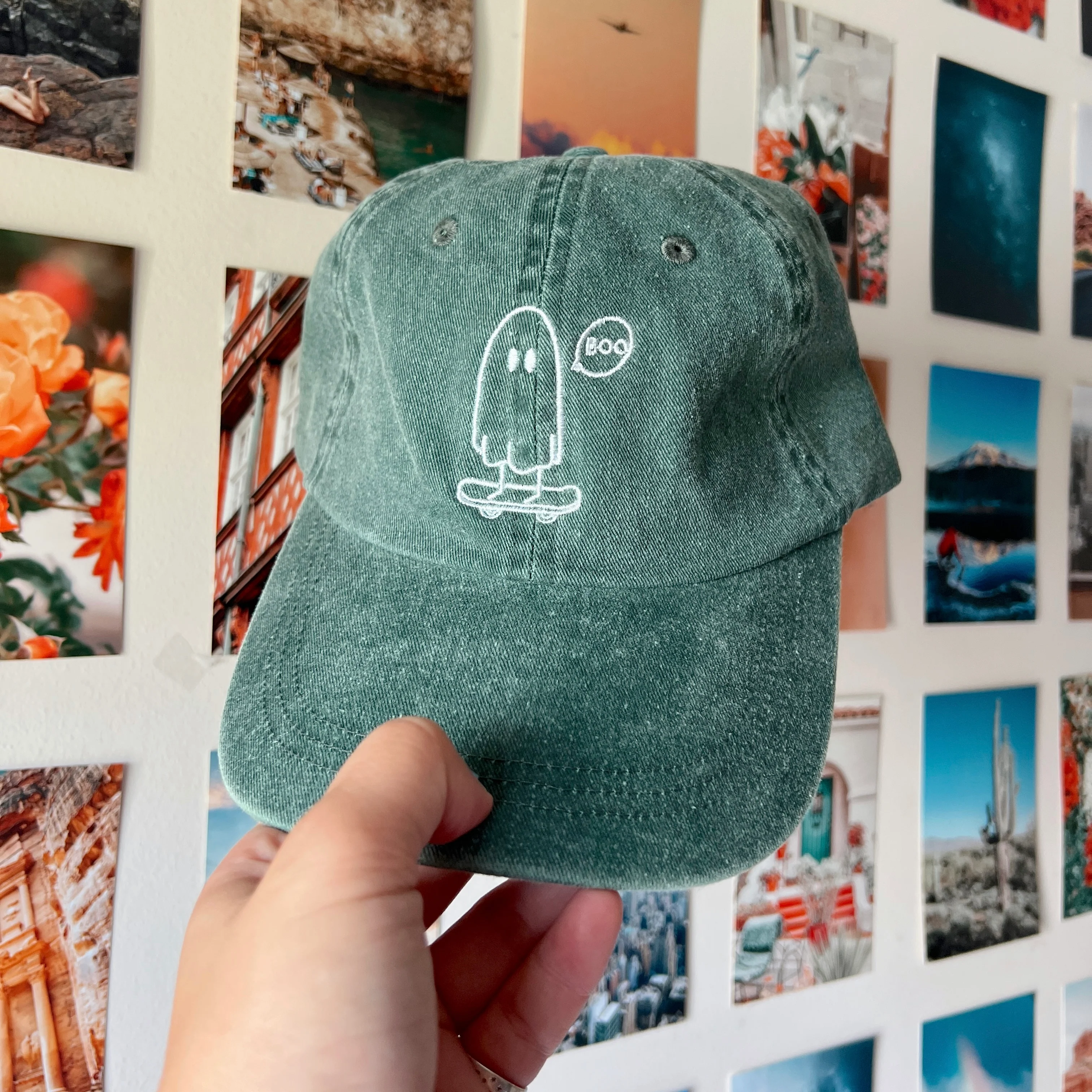 Your favorite ghosty is back and better than ever! These pigment dyed hats have a washed out look to them giving a real vintage feel. Choose from dark green or a faded black!