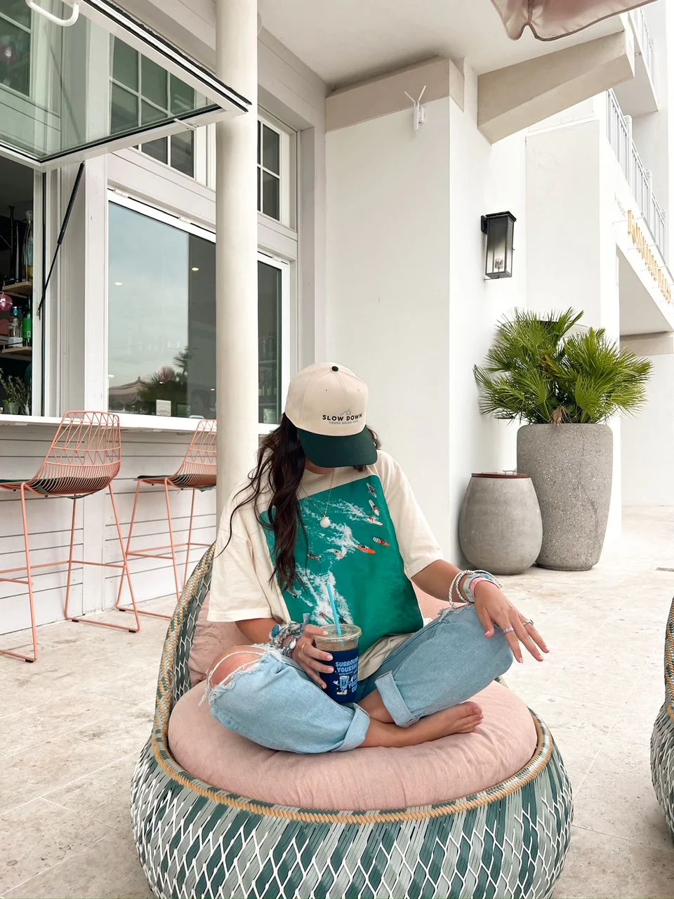 These tees scream summertime! Featuring a beautiful scene of surfers and the most vibrant colors.