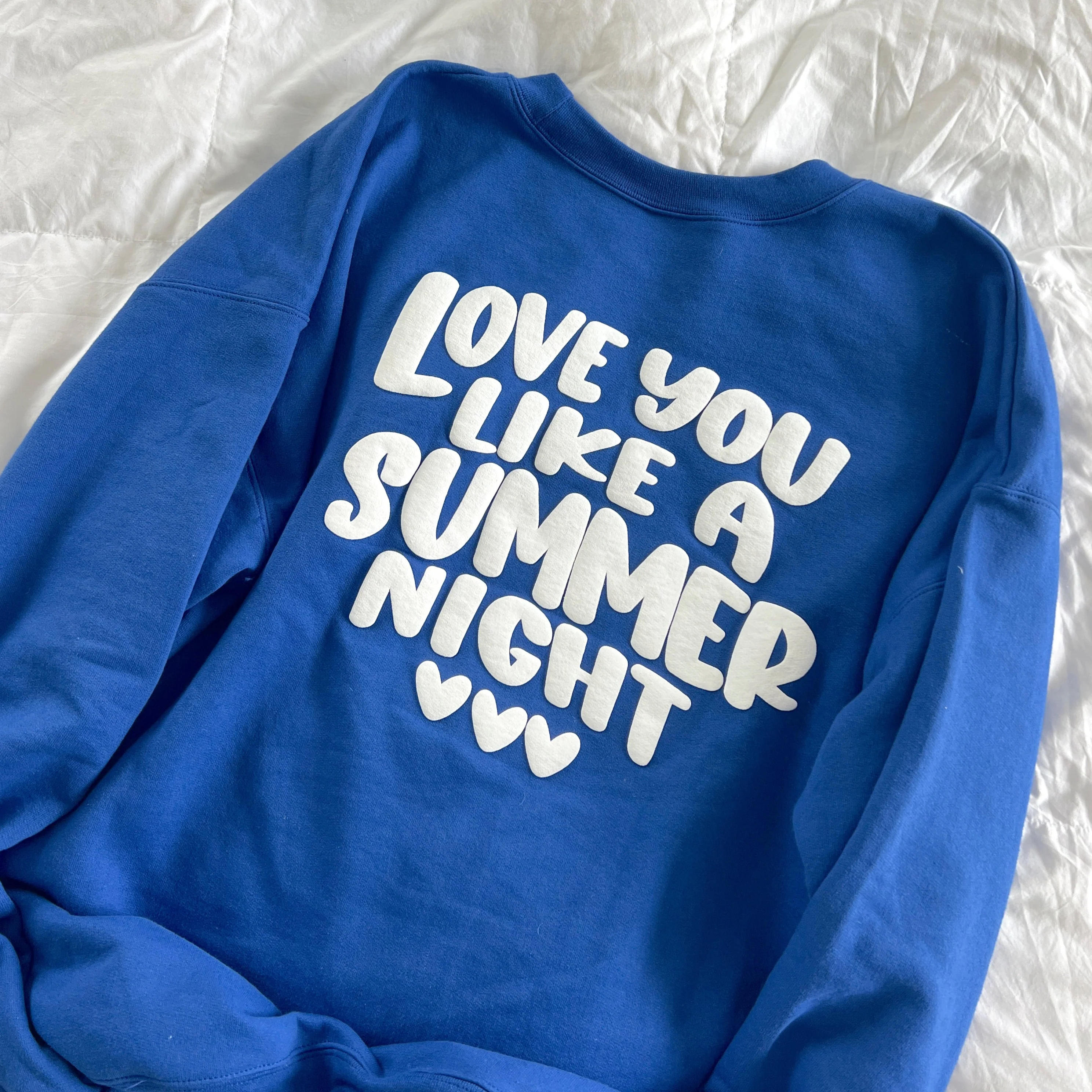 Say hello to the crewneck of the summer! These royal blue crews are equipped with a beautiful puff print design that gives fluffy marshmallows. The back has the large love you like a summer night design across it and the front features three lil puffy hearts.